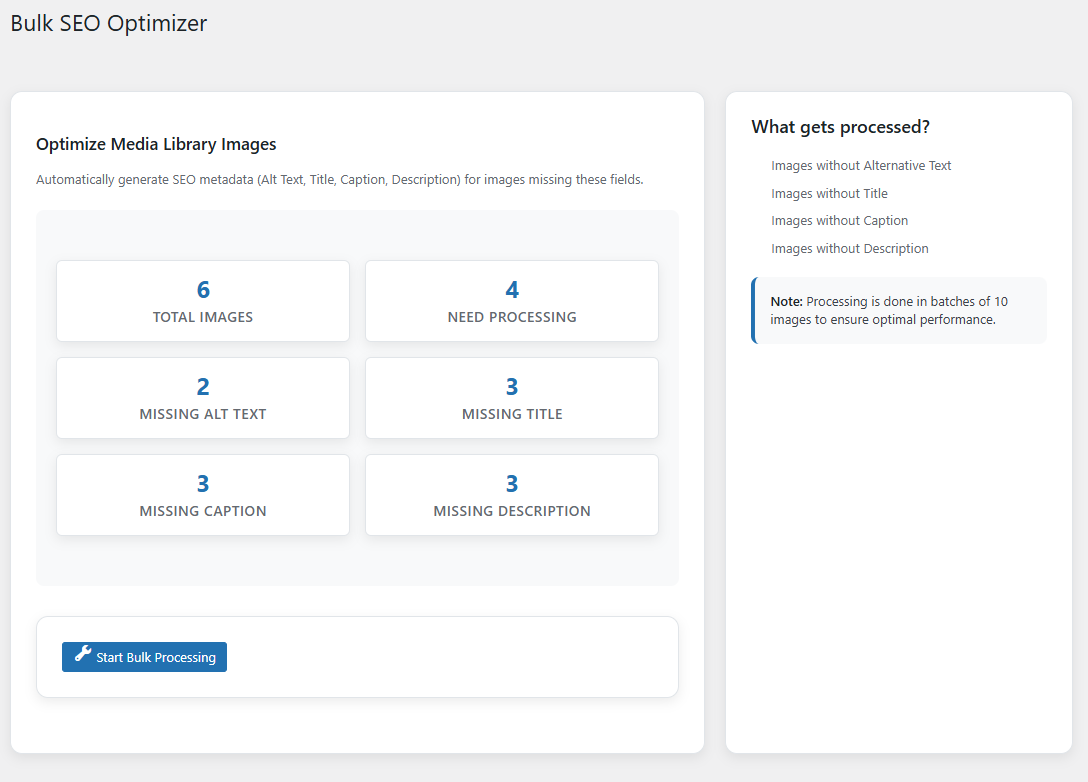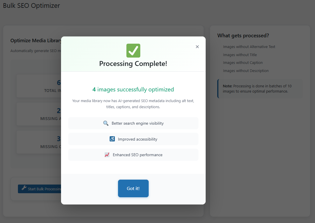 • Bulk AI Processing – Enhance or replace multiple images in your media library at once.