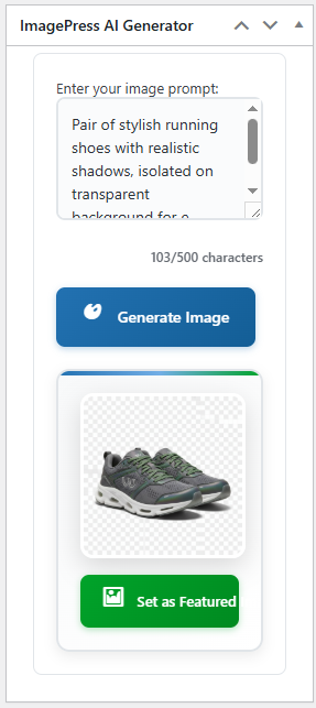 • One-Click Featured Images – Instantly set your generated images as featured images for posts or pages.